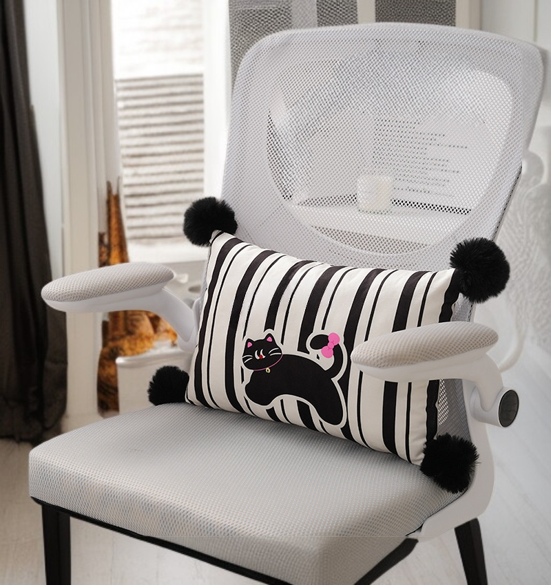 Soft striped pillow with black cat design, made from durable fabric. Enhances home decor, suitable for couches and beds. Easy to clean, comfortable support.